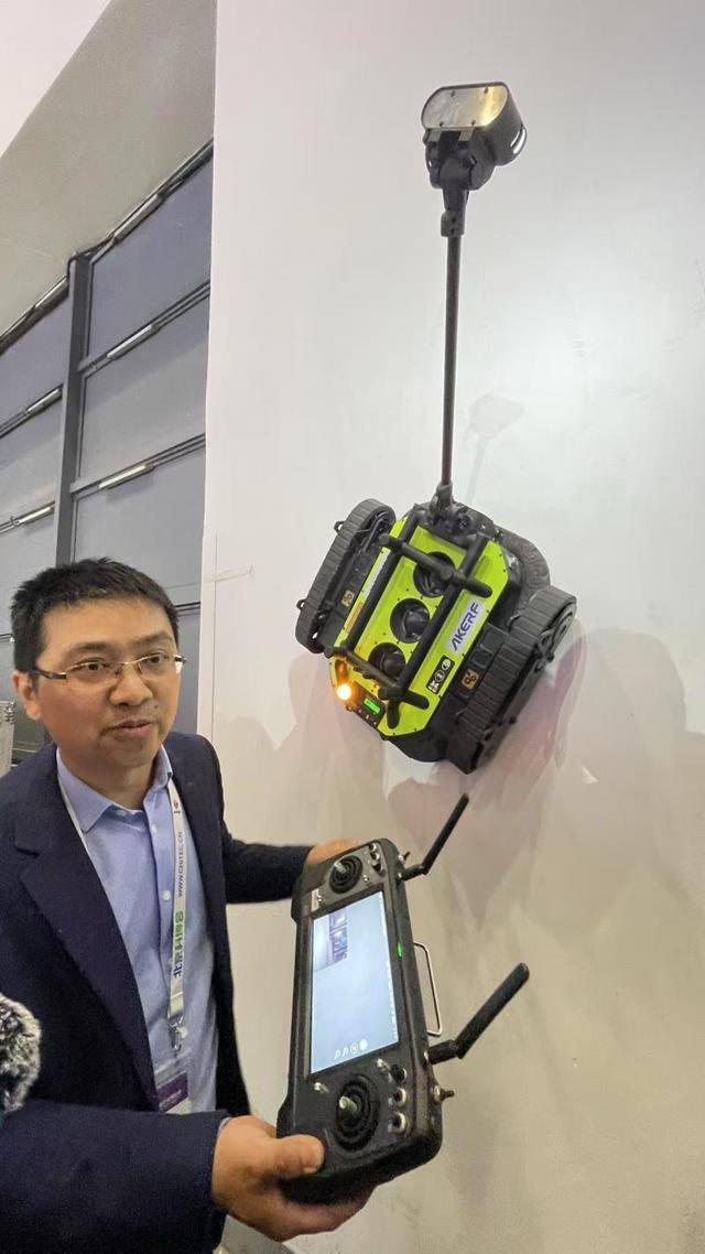一台“爬墙机器人”在完全垂直于地面的白墙上,奥克福机器人科技CEO柴建伟轻轻点击几下遥控器,机器人就轻松爬上墙面,还可做扫描等工作。