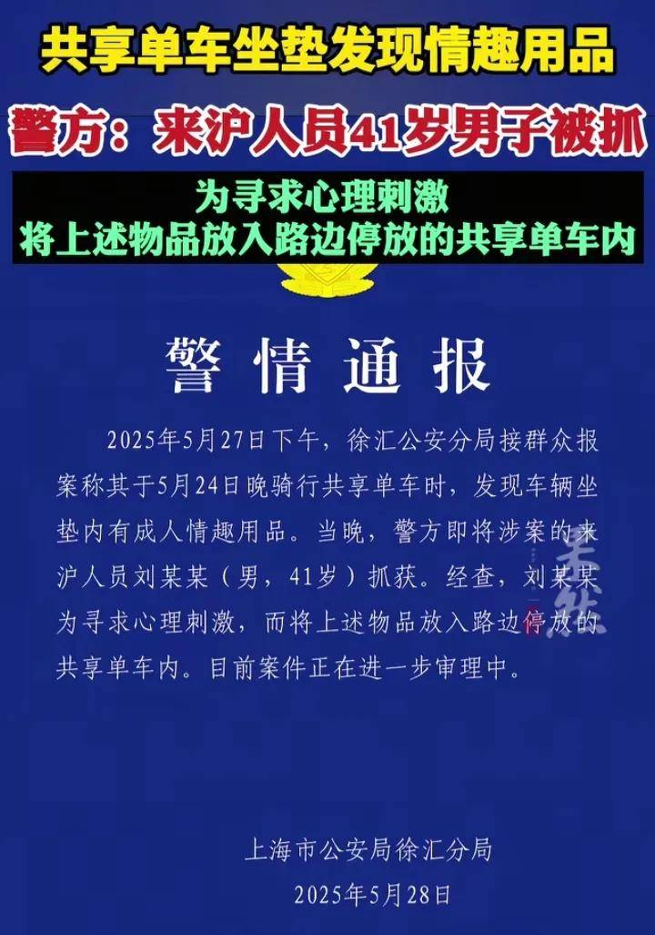 男子刘某某41岁,来沪人员,经查,刘某某为了寻求心理刺激,而将这个物品放入路边停放的共享单车里,目前案件正在进一步审理中。