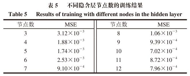 由相关性分析结果可知,与Peleg模型参数显著相关的理化性质有脂肪、单宁、直链淀粉和支链淀粉含量、硬度和比表面积。其中,因为各品种高粱的直链淀粉和支链淀粉含量呈极显著负相关,且相关系数为-0.88,绝对值大于0.8,说明两者之间有很强的线性相关性,因此只选择其一作为BP神经网络的输入层,以脂肪含量、单宁含量、直链淀粉含量、硬度、比表面积、浸泡时间和初始水分含量作为输入层,以任意时刻高粱的含水率为输出层,因此输入层节点数为7,输出层节点数为1。本研究BP神经网络的隐含层节点数为3~12。将23 个不同品种高粱样本的428 组数据作为BP神经网络的训练数据,对不同隐含层节点数的BP神经网络进行训练,其训练结果如表5所示。节点数为10时,MSE最低,因此本研究BP神经网络隐含层节点数选择为10。输入层节点数为7,隐含层节点数为10,输出层节点数为1,因此BP神经网络结构为7-10-1。
