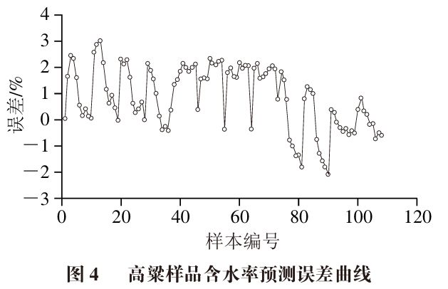 将6 个测试样本Y1~Y6实验测得的108 组数据输入训练好的模型进行仿线所示,误差=实验值-预测值,用于测试的样本中,大部分预测误差集中在-2%~3%之间。经计算,实验值与预测值之间的相关系数为0.99,MSE为0.02,可见BP神经网络具有较高的预测精度,能够很好地预测高粱在恒温(40 ℃)浸泡过程中的水分含量。如果高粱泡粮过程工艺参数和高粱本身的相关性质已知,训练后的BP神经网络则可以用于水分含量的预测,然后反向调整泡粮工艺参数,从而在实际酿造生产中迅速适应各种品种和特性的高粱原料,缩短复杂的实验探索过程,降低生产成本。