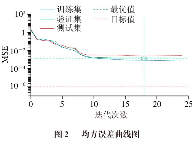 隐含层节点数为10,传递函数依次为tansig函数和purelin函数,设置学习速率为0.01,迭代次数为1 000 次,学习目标为0.000 001时,在经过18 次迭代时达到最佳训练状态,最小MSE为0.001 276 7,MSE曲线所示。